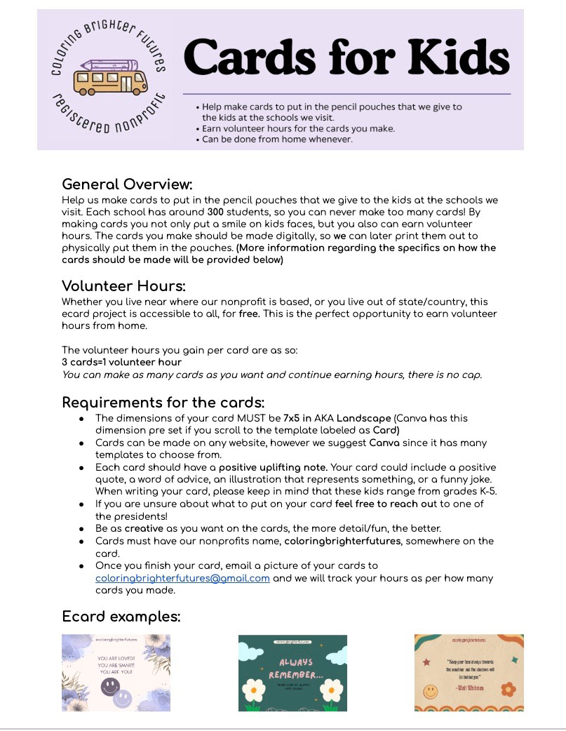 We have a new opportunity open to anyone who's looking to earn volunteer hours in a very easy and fun way!!! Best part is: you can do it from home! Cards for Kids is an opportunity open all year long. To learn more information about how to participate and earn volunteer hours, click the link below to see the flyer!